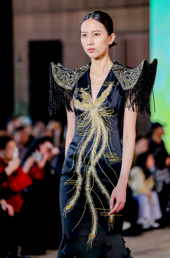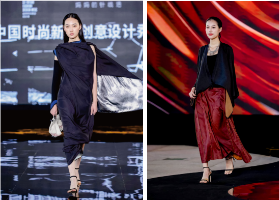 同期举行的中国时尚新锐创意设计秀,是促进会产业赋能与人才培育职能的生动实践。作为福田时尚创意设计周的核心组成部分,秀场集结青年设计师的先锋作品,其背后正是促进会整合“品牌-设计师-非遗匠人”资源的成果——设计师们萃取非遗纹样、民族色彩,以现代剪裁与创意手法重构东方美学,将文化资源转化为时尚资产。开场童声合唱《大眼睛》诠释代际传承,《命运的针线》宣传片聚焦非遗绣娘,与秀场作品共同勾勒出促进会“以美育人、以爱传城”的生态理念,而这一理念也贯穿于促进会“小小服装创意设计课”“连衣裙艺术展”等系列公益项目中。